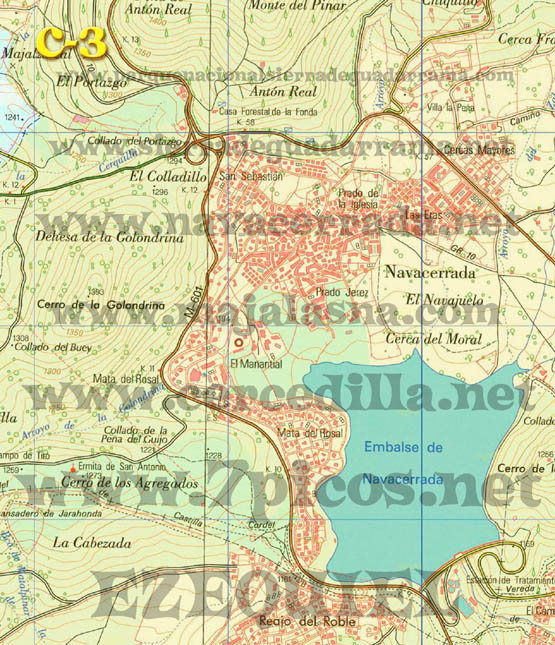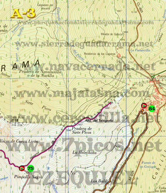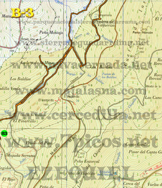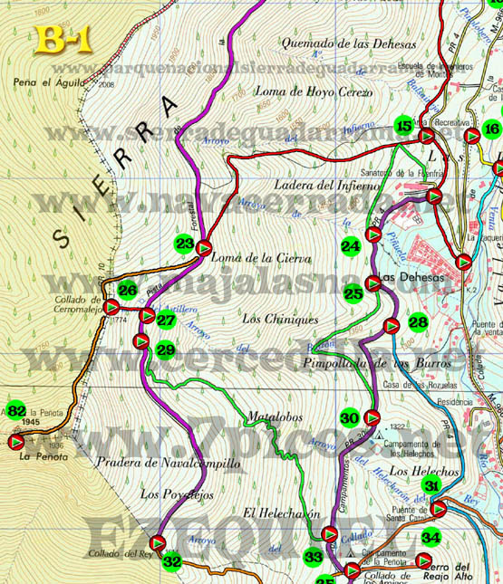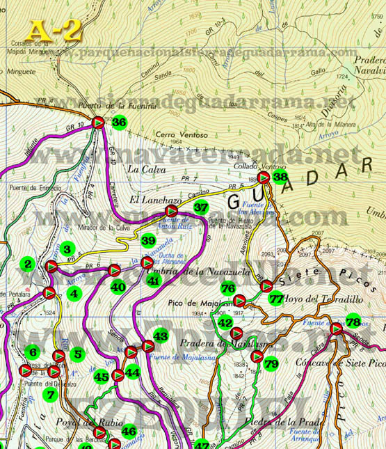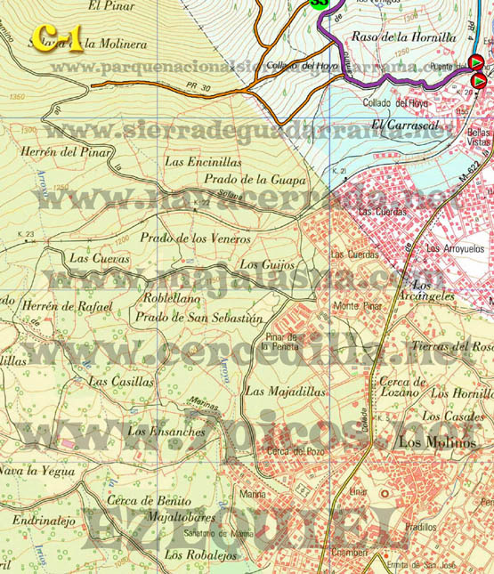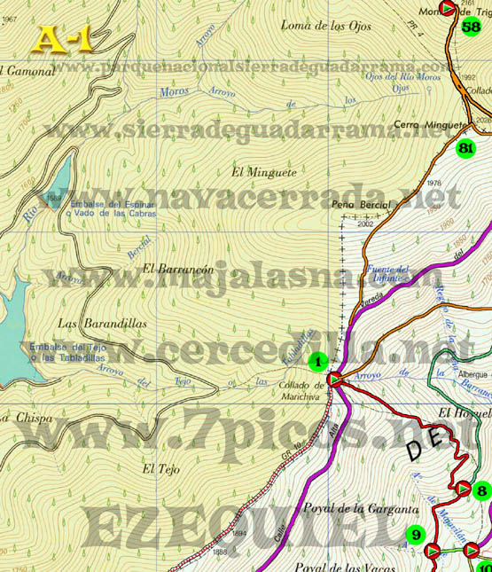 Con este plano de rutas de Cercedilla podrás diseñar tu propia ruta. Están todas las carreteras, caminos, sendas, incluso aquellas señaladas por “hitos de piedra”. Los caminos han sido trazados con apoyo de GPS y son totalmente fiables. Un circulo rojo que en su interior tiene un triangulo verde significa, cruce de caminos, inicio o fin de ruta. Un circulo verde con numeración en su interior significa, el número del cruce al que podemos referirnos al describir una ruta. Para ver, bajarte o imprimir este plano a tamaño GRANDE hacer “ClicK” AQUÍ. Para ver, bajarte o imprimir este plano a tamaño SUPERGRANDE hacer “ClicK” AQUÍ. El plano GRANDE está compuesto de 9 partes: A1- A2 – A3 – B1 – B2 – B3 – C1-C2 – C3. Para bajarte el plano completo tienes que ponerte en cada una de las partes, hacer click con el botón derecho del ratón y seleccionar “Guardar Imagen”. Para imprimir el plano tienes que hacerlo igualmente con cada una de las partes. El plano SUPERGRANDE está compuesto de 9 partes: A1- A2 – A3 – B1 – B2 – B3 – C1-C2 – C3. Para bajarte el plano completo tienes que ponerte en cada una de las partes, hacer click con el botón derecho del ratón y seleccionar “Guardar Imagen”. Para imprimir el plano tienes que hacerlo igualmente con cada una de las partes, es preferible que para imprimir el plano lo cargues con un programa de dibujo, imágenes o fotografía porque tiene una resolución de 200 pixel por pulgada. Algunos navegadores podrían ignorar esta resolución y dejar de imprimir partes del plano. |